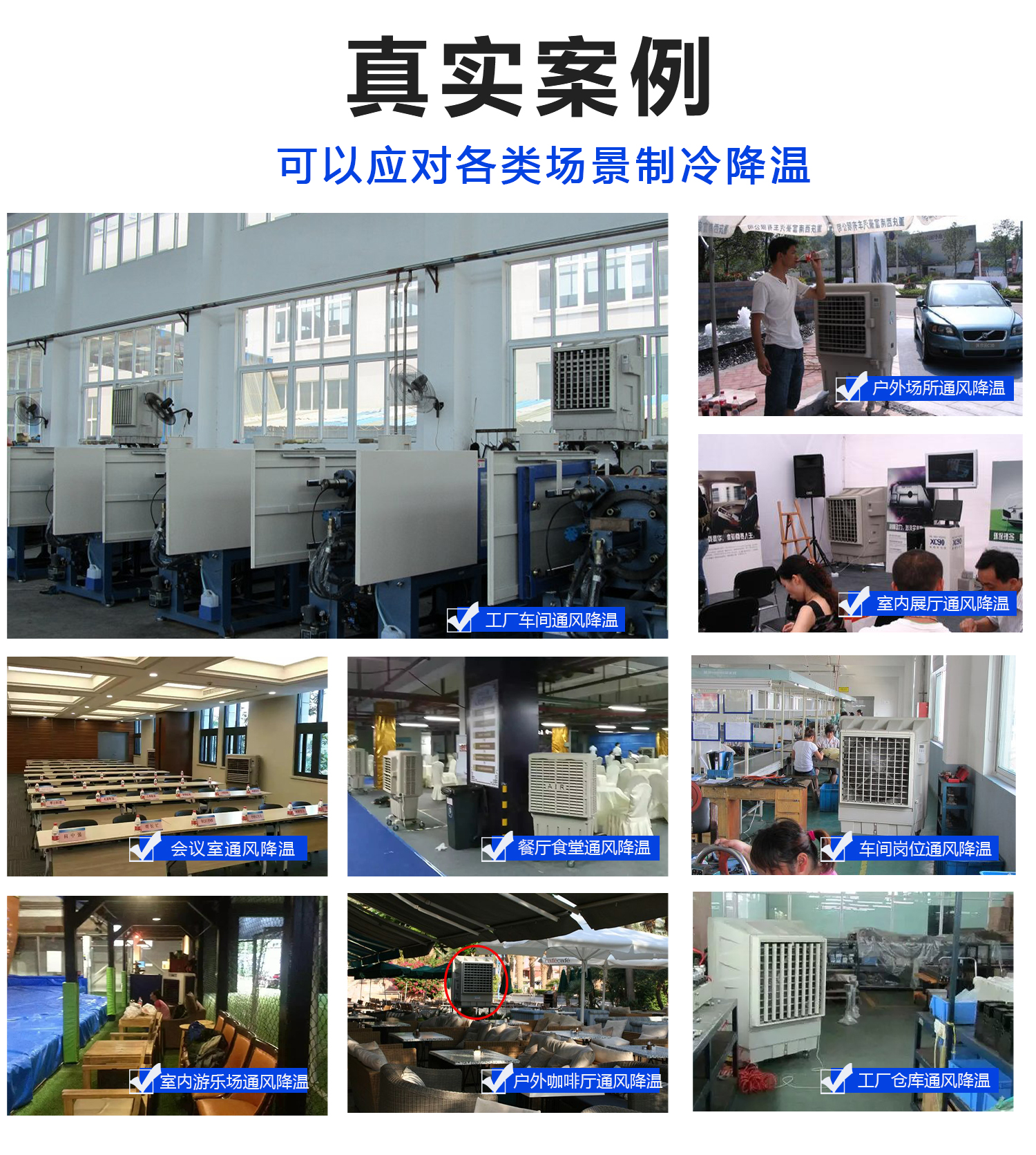 KT-30广泛适用于:工业车间、临时施工棚、仓库、办公区、机房、餐厅及公共场所等大空间降温场景。